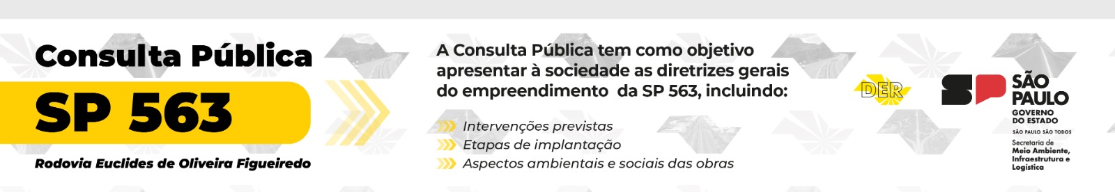 O Departamento de Estradas de Rodagem do Estado de São Paulo (DER-SP) disponibiliza, para consulta pública pelo período de 10 (dez) dias, a Avaliação Ambiental e Social (AAS) e o Programa de Gestão Ambiental e Social (PGAS) das obras para Recuperação das pistas, acostamentos e implantação de melhorias da rodovia Euclides de Oliveira Figueiredo, SP- 563, no trecho do km 135,42 ao km 200,660.