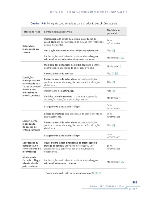 Quadro 17.6: Principais contramedidas para a redução de colisões laterais