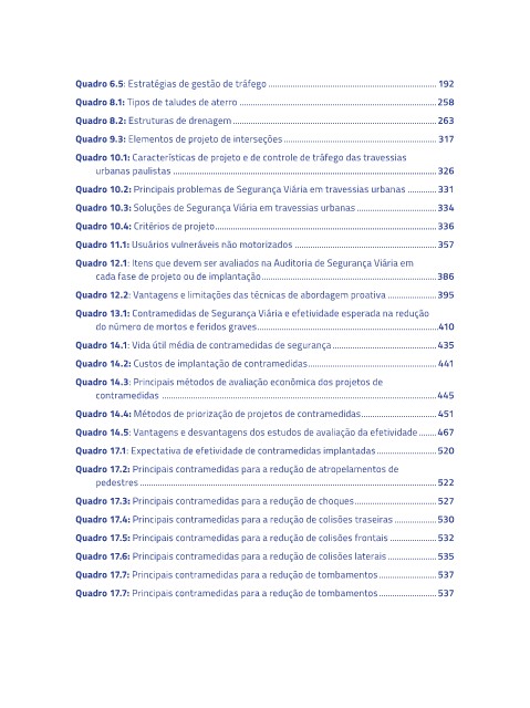 Quadro 17.4: Principais contramedidas para a redução de colisões traseiras ...................530