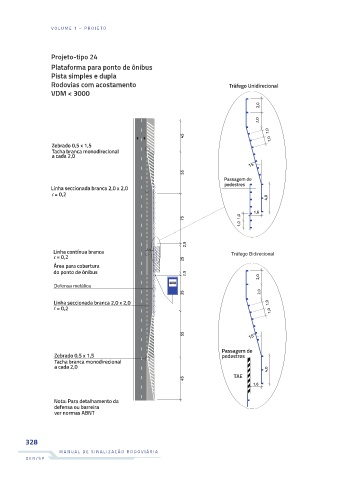 V OL UME 1 – PRO JET O Projeto-tipo 24 Plataforma para ponto de ônibus Pista simples e dupla Rodovias com acostamento VDM < 3000 328 MANU AL DE SINALIZA ÇÃ O RODO VIÁRIA DER / SP